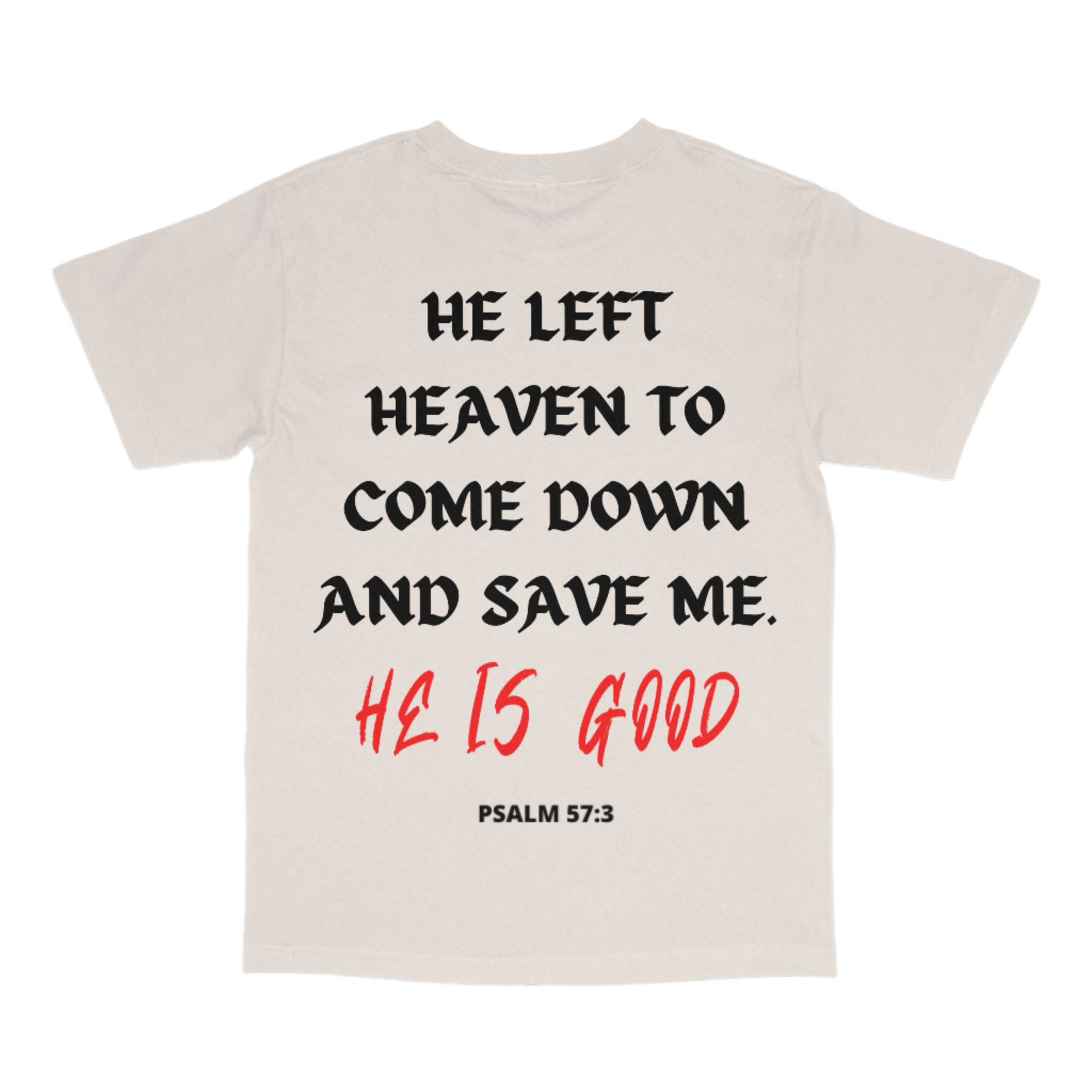Bold Faith Statement – “He Left Heaven to Save Me” printed in eye-catching lettering